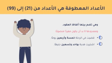 ?الأعداد المعطوفة هي الأعداد من (? )21?إلى (?)99?? ?وهي تضم بينها ألفاظ العقود?.?? ?ومعدودها لا بد أن يكون مفر ًدا منصو ًبا?:?? ?• قضيت في الرحلة خمسة وأربعين يو ًما?.?? ?• اشتريت هدية بواحد وتسعين جنيهًا?.??