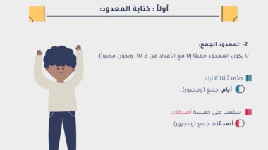 ?أول ًا ? :?كتابة المعدود?:?? ?? -2?المعدود الجمع?:?? ?لا يكون المعدود جمعًا إلا مع الأعداد من ? ،10 :3?ويكون مجرو ًرا?:?? ?ُصمتُ ثلاثة أيام?.?? ?أيام? :?جمع (ومجرور)?.?? ?سلمت على خمسة أصدقاء?.?? ?أصدقاء? :?جمع (ومجرور)?.??